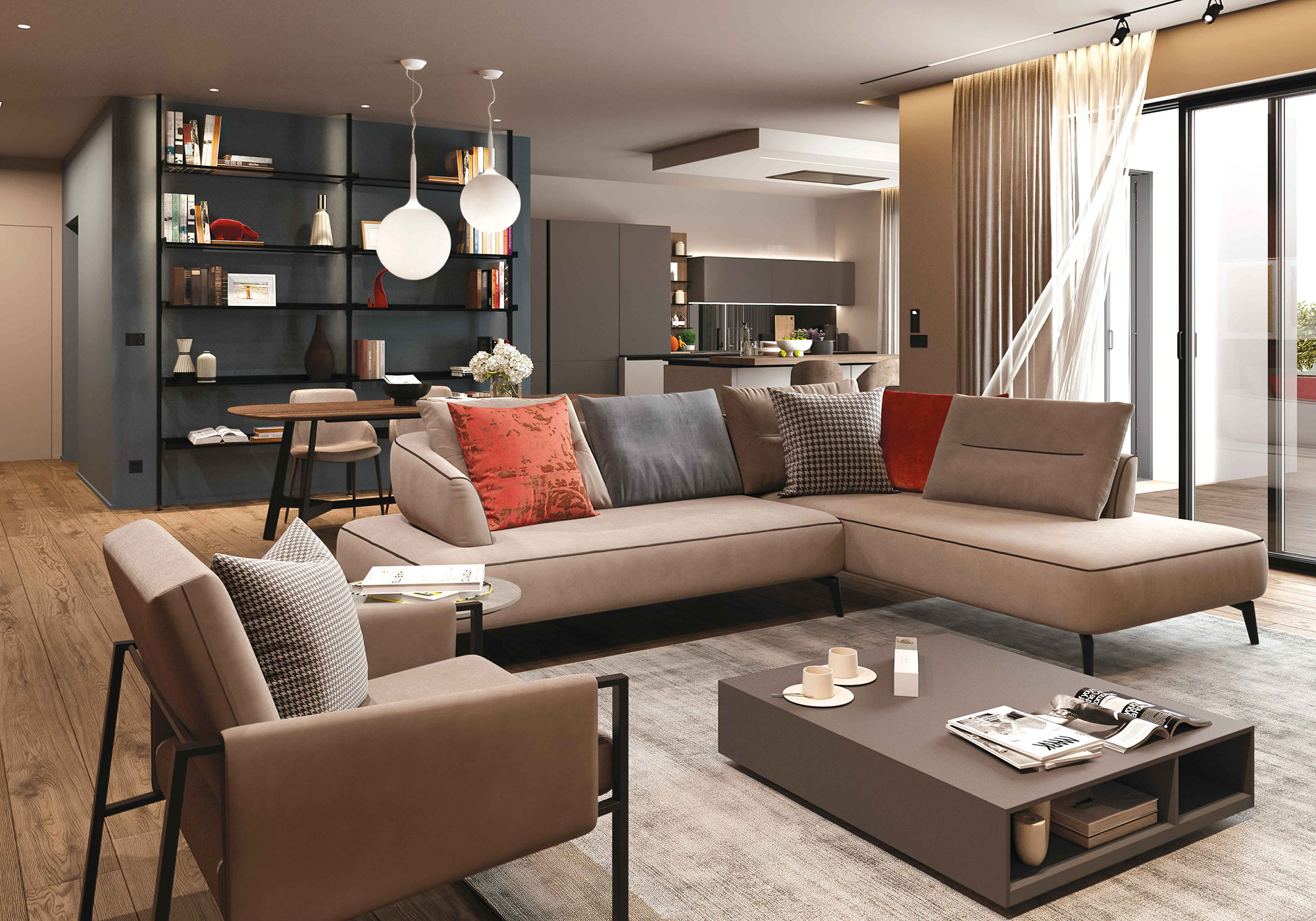 Se il soggiorno è collocato in una stanza dedicata si può puntare a creare un’atmosfera più raccolta e intima. Arredi su misura, soluzioni salvaspazio e mobili visivamente leggeri come elementi sospesi o tavolini in vetro aiutano a non appesantire l’ambiente. La disposizione deve favorire una fruizione comoda dello spazio, con passaggi ben definiti e un giusto equilibrio tra superfici piene e vuote.